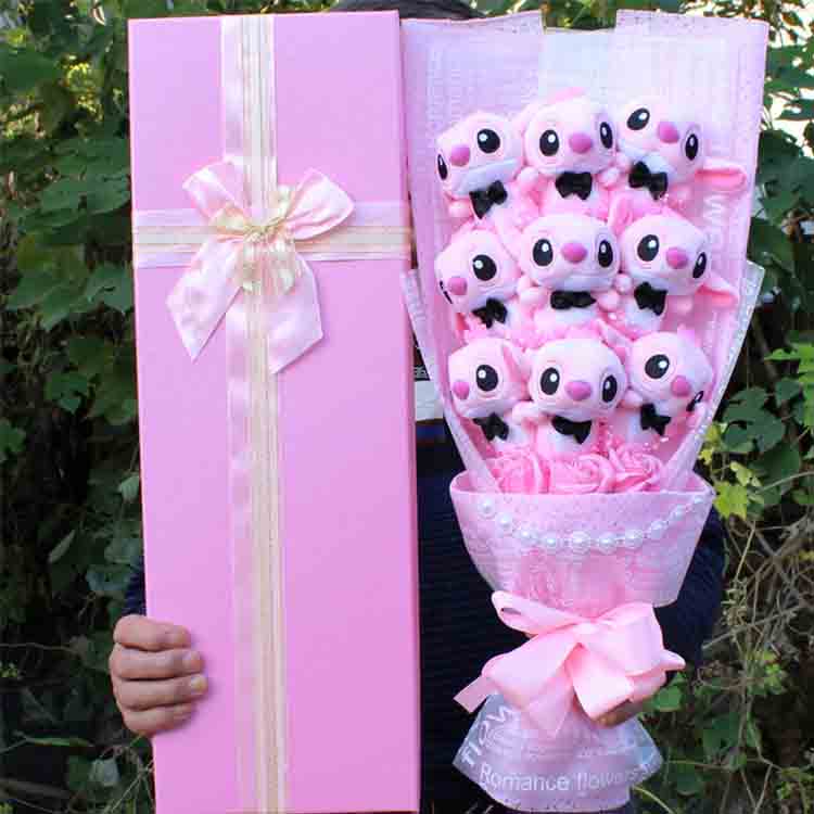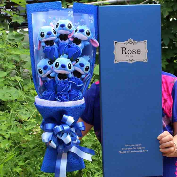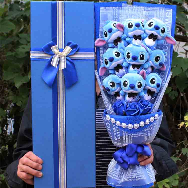 Cute Stitch Cartoon Bouquet paketeak kolore bereko bederatzi lore artifizial ederren artean kokatutako sei puntu adoragarri ditu. Bestea bederatzi puntuko lagunekin dator, eta lorearen behealdea kolore bereko hiru lore artifizialez apainduta dago.