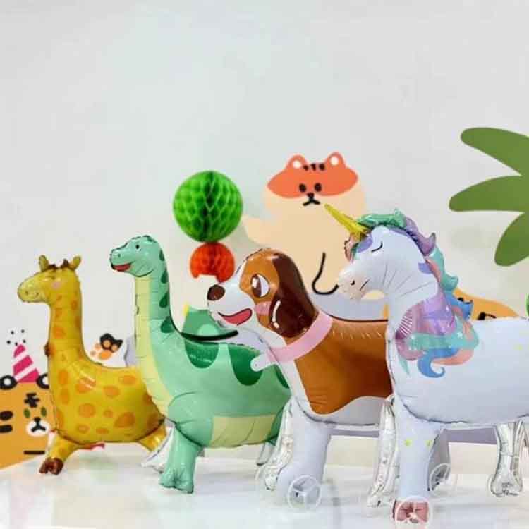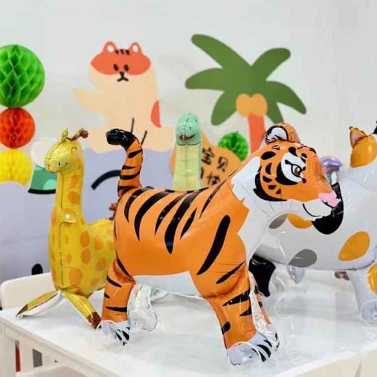Haurren urtebetetze festa: urtebetetze festan, hainbat marrazki bizidunetako animalia-foil globoan, hala nola lehoiak, tigreak, jirafak, hartzak, etab.