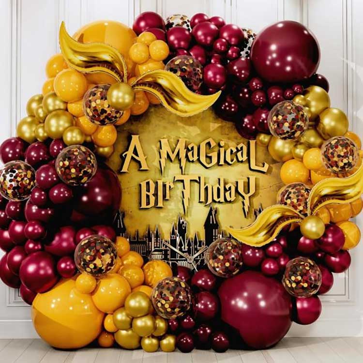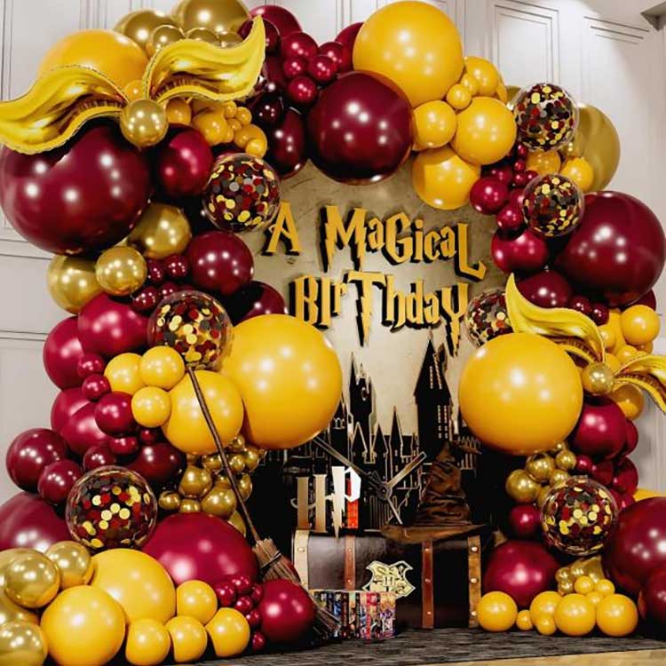 Harry Potterren globo-girandaren kitaren diseinua globo-girlanda handi eta eder bat da; multzo honetan, latexezko puxika guztiak kalitate handiko latex natural hutsez eginak daude, nolabaiteko lodiera eta elastikotasunarekin eta kalitate bikainekoa; bere ezaugarri tipikoak kolore biziak eta fideltasun handiko erreprodukzioa dira, magia morroiak maite dituzten guztiei hor egongo balitz bezala sentitzeko aukera ematen dien ezaugarri tipikoa da. Globo biribil estandarrez gain, multzoak urrezko adar-formako paperezko globoak apaingarriak ditu. Behin puztuta, horiek edozein lekutan jar daitezke zure lehentasunaren arabera.