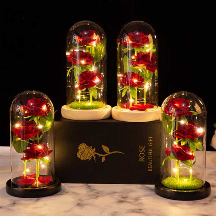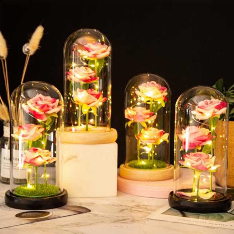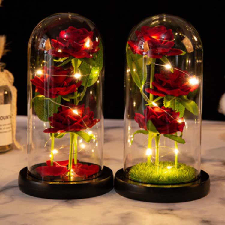 Arrosa beirazko kupularen barruan hiru lore kontserbatu daude altuera ezberdinetan kokatuta, zurtoin errealistarekin eta hosto berdeekin. Beirazko estalkia beroarekiko erresistentea da eta ez da erraz hondatzen. LED kate-argiek argi leuna dute, eta etengailua egurrezko oinarriaren azpian dago erraz funtzionatzeko. opari txartela.