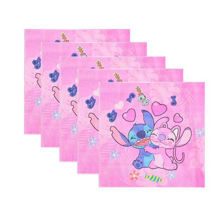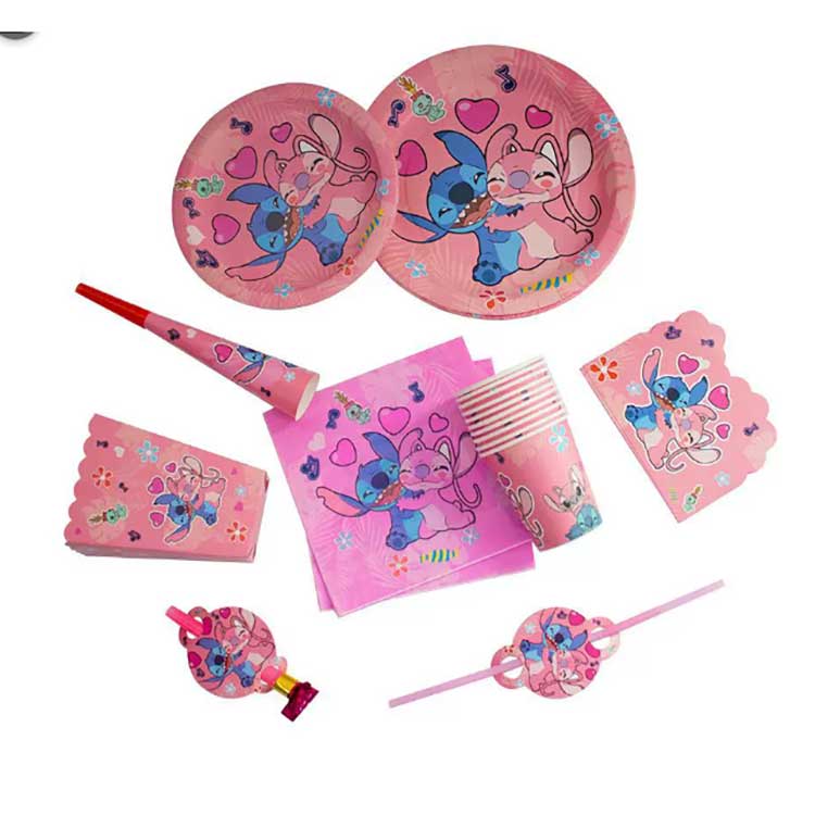 Stitch botatzeko plater-multzoak produktu hauek ditu: 7 hazbeteko platerak (10 pz/poltsa), 9 hazbeteko platerak (10 pz/poltsa), ezpainzapiak (20 pz/poltsa), banderolak (10 pz/poltsa), itzulerako opari poltsak (10 pz/poltsa), krispetak kaxak (6 pz/poltsa), dragoi puzgarriak (6 pz/poltsa), paper-poltsa (6 pz/poltsa), paper-poltsa (10 pz/poltsa), (6 pz/poltsa), lastoak (10 pz/poltsa), gonbidapen-txartelak (10 pz/poltsa), maskarak (10 pz/poltsa), koilara, mahai-tresnak (10 pz/poltsa) eta mahai-zapia (1 pz/poltsa). Multzoak 17 produktu mota ezberdin ditu. Bezeroek multzo osoa erostea edo elementuen zati bat bakarrik hauta dezakete beren beharrak asetzeko.